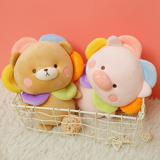 Kawaii Bär & Schweinchen Plüschpuppen mit niedlichen Blumenhüten